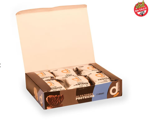 Alfajor proteico con 12 gr de proteina, relleno de Dulce de Leche Proteico Doña Magdalena y cubierto con chocolate blanco. Libre de gluten.