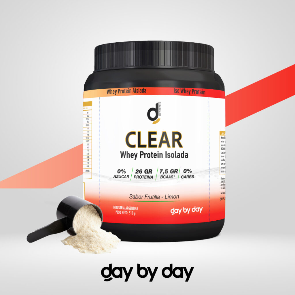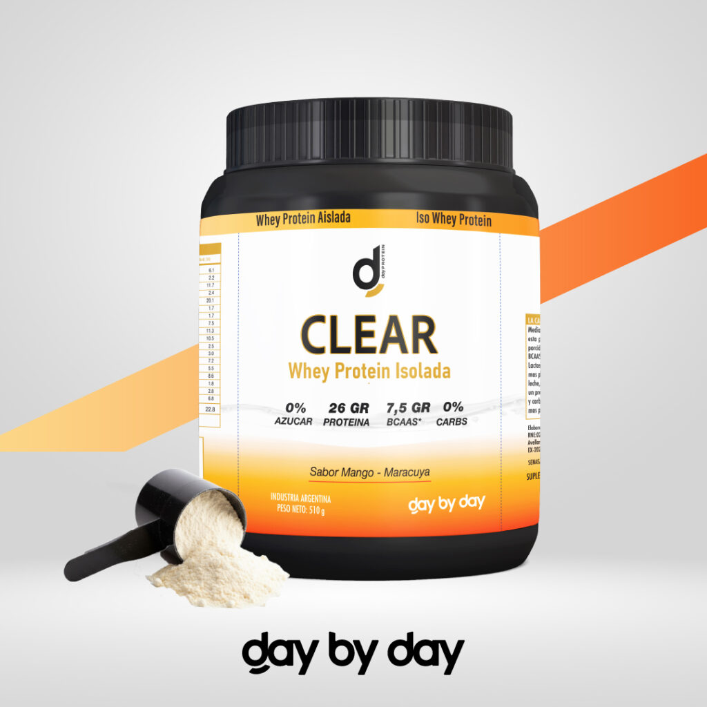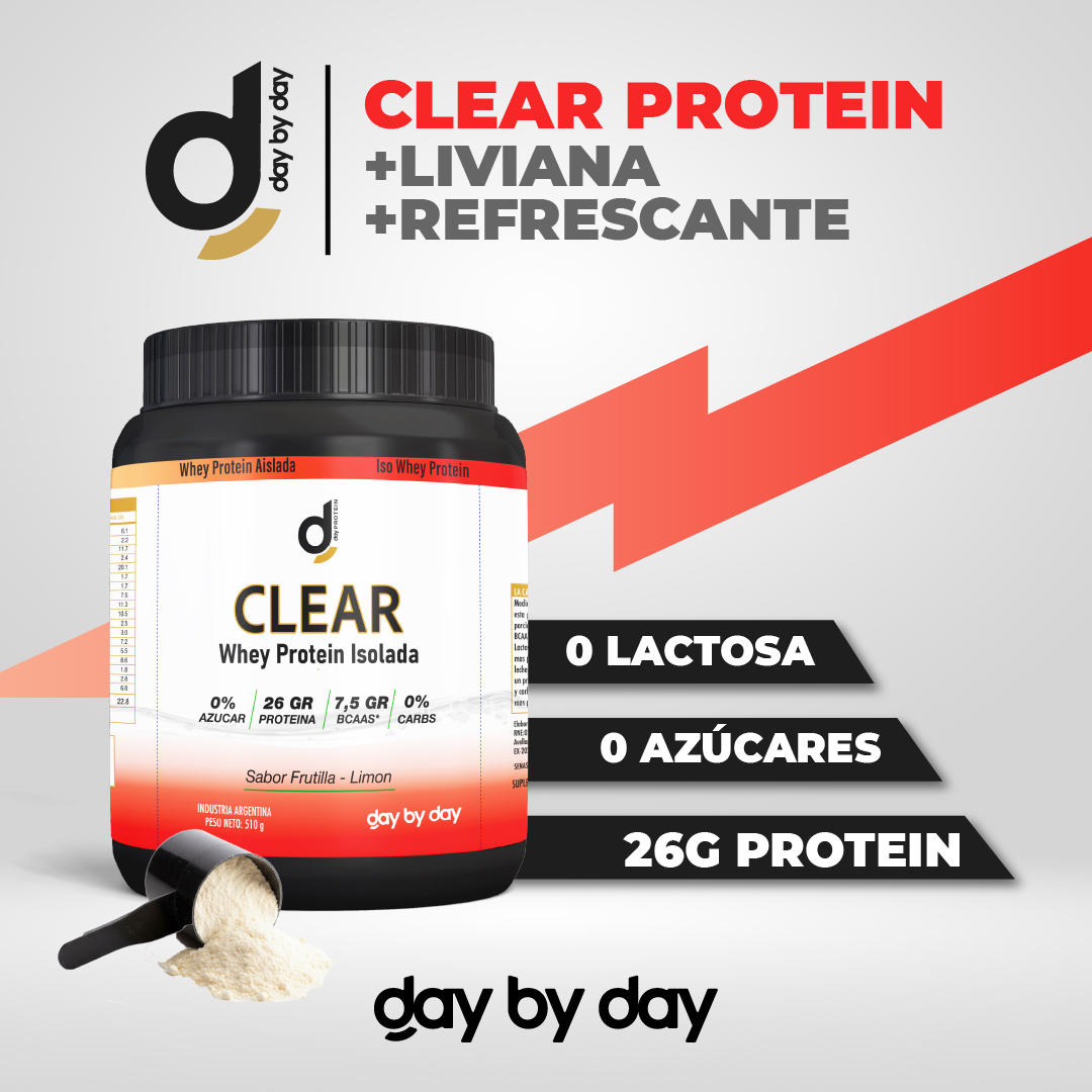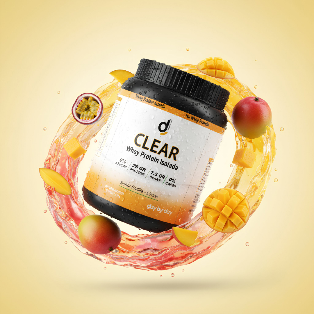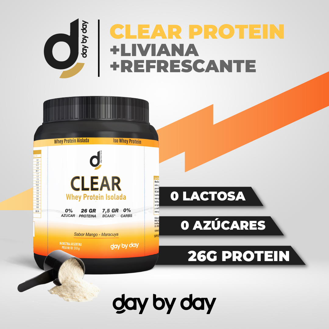 CLEAR Whey Protein Aislado 100%. No contiene azúcares ni carbohidratos. 0% Lactosa. Esta nueva variante CLEAR hace que la proteína se sienta y se disuelva como un jugo. Con sus sabores frutales la ingesta de la Proteina Clear Day by day se convierte en una experiencia refrescante y liviana. Disfrutá la proteína.